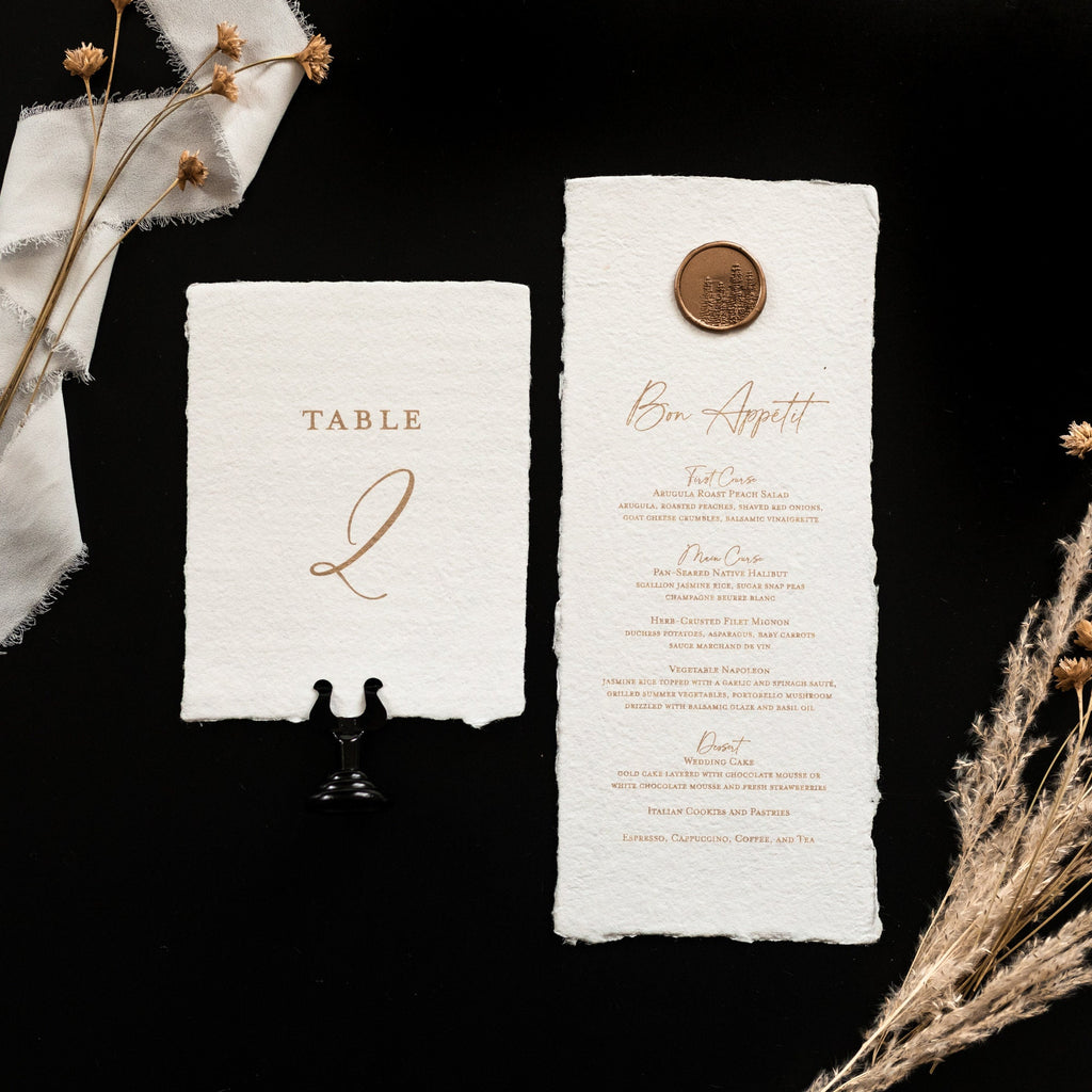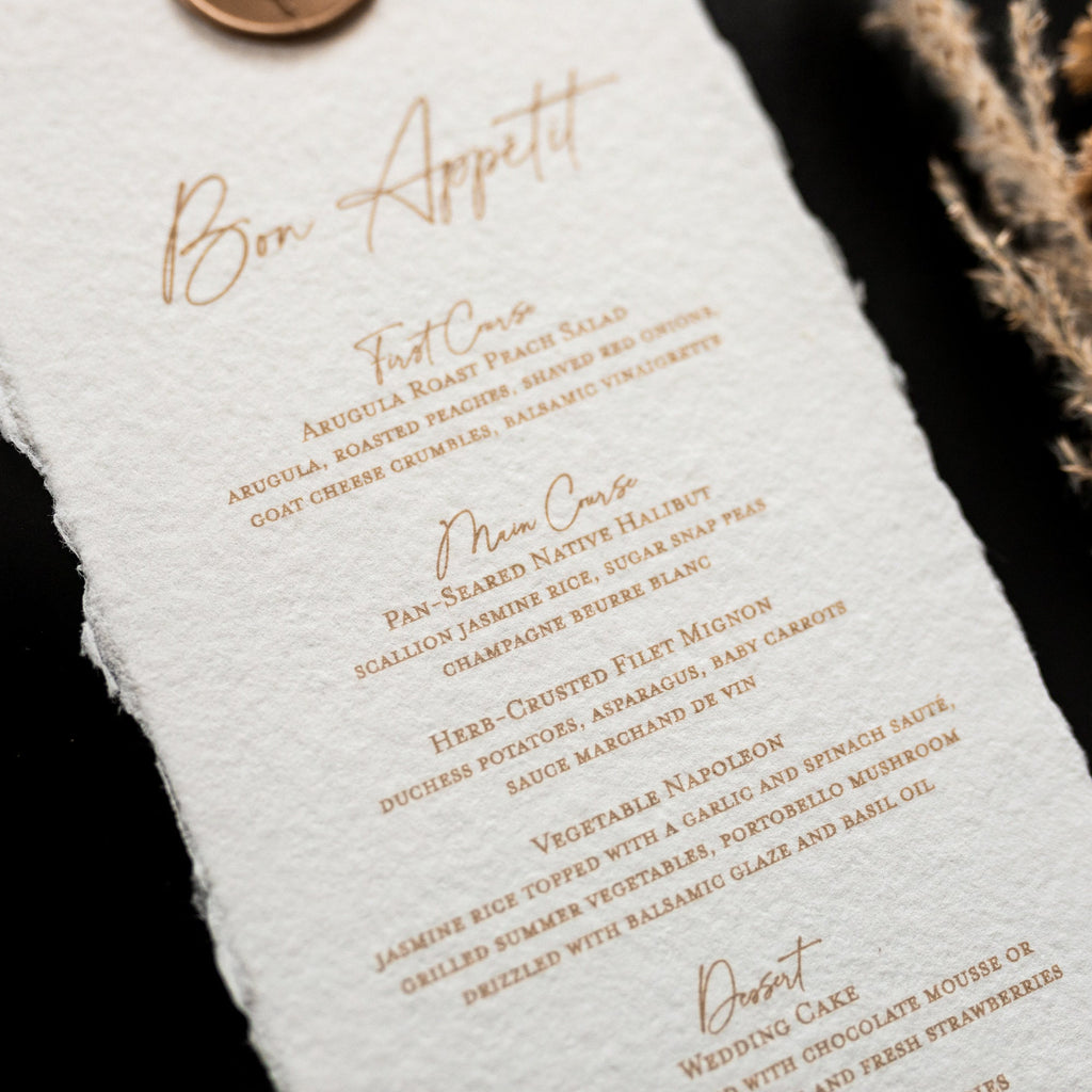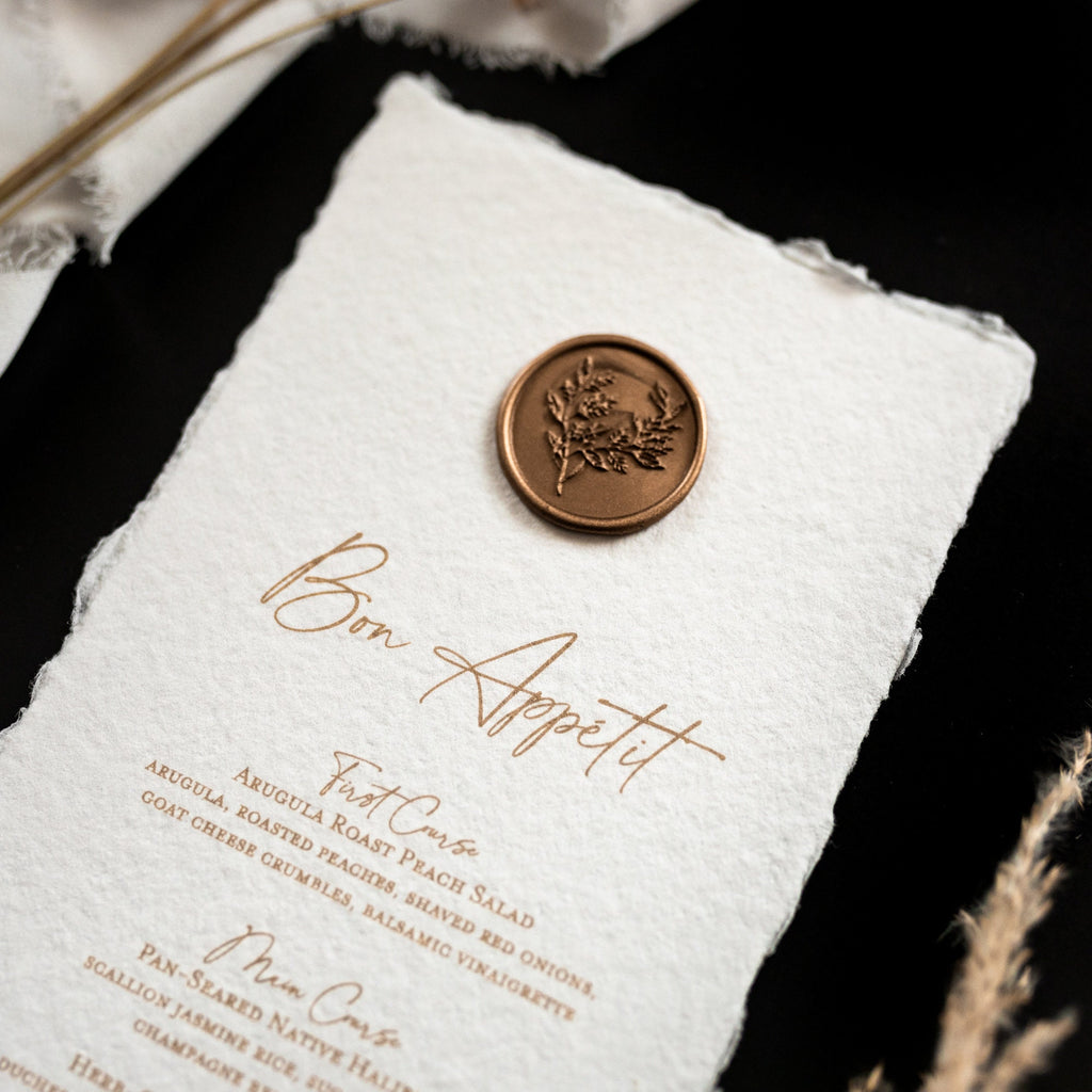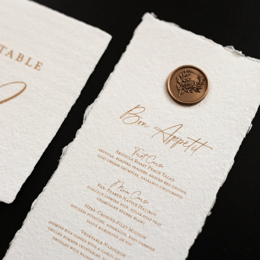 Wedding Menu (Set of 10) Matte Gold Ink- Bon Appetit Slim Wedding Menu- Deckled Edge Menu-Wax Seal Wedding Menu- Birthday Menu